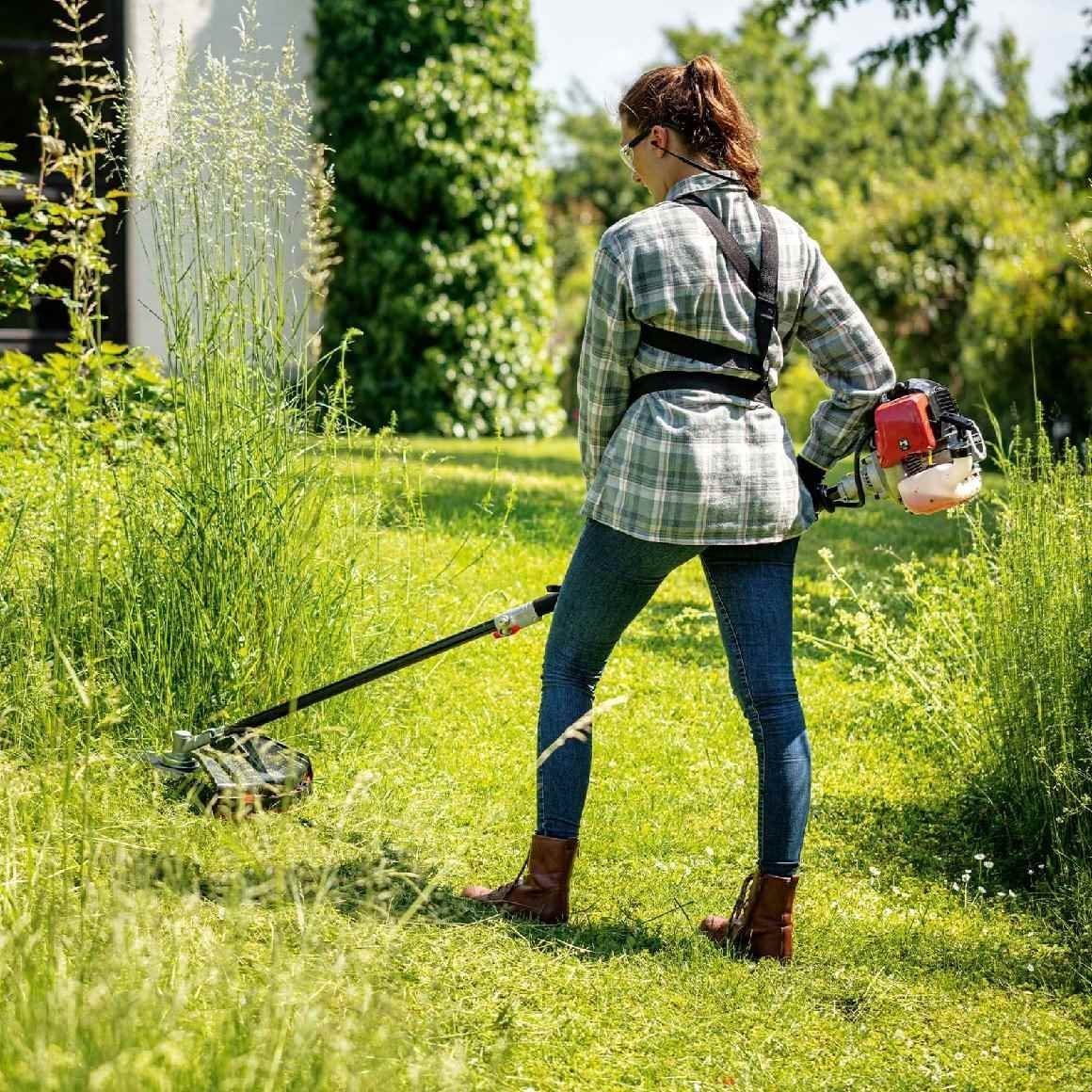Ein leistungsstarker 2-Takt-Benzinmotor mit 42,7 cm³ Hubraum sorgt für die nötige Kraft, um diese Aufgaben zu erledigen. Die vibrationsgedämpfte Bauweise und der mitgelieferte Schultergurt mit Hüftschutz sorgen für angenehmes sowie ermüdungsfreies Arbeiten. Dank Schnellverschluss lässt sich das Gerät mit nur einem Handgriff vom Rasentrimmer, zur Motorsense, zur Heckenschere, zum Hochentaster oder zum Laubbläser umrüsten.