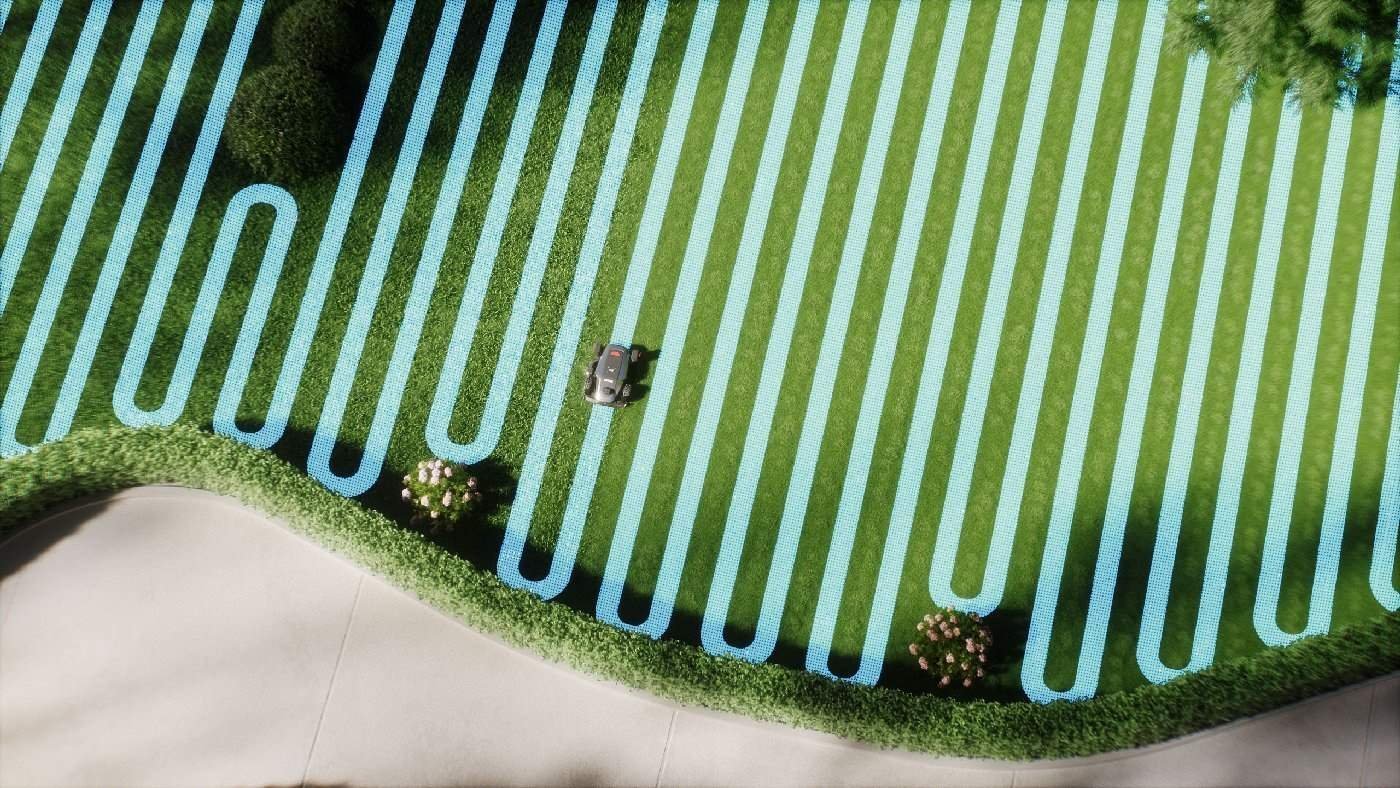 Über das eingebaute GPS-Modul erkennt das Gerät, welche Flächen schon gemäht wurden und fährt dann gezielt noch ungemähte Flächen an.