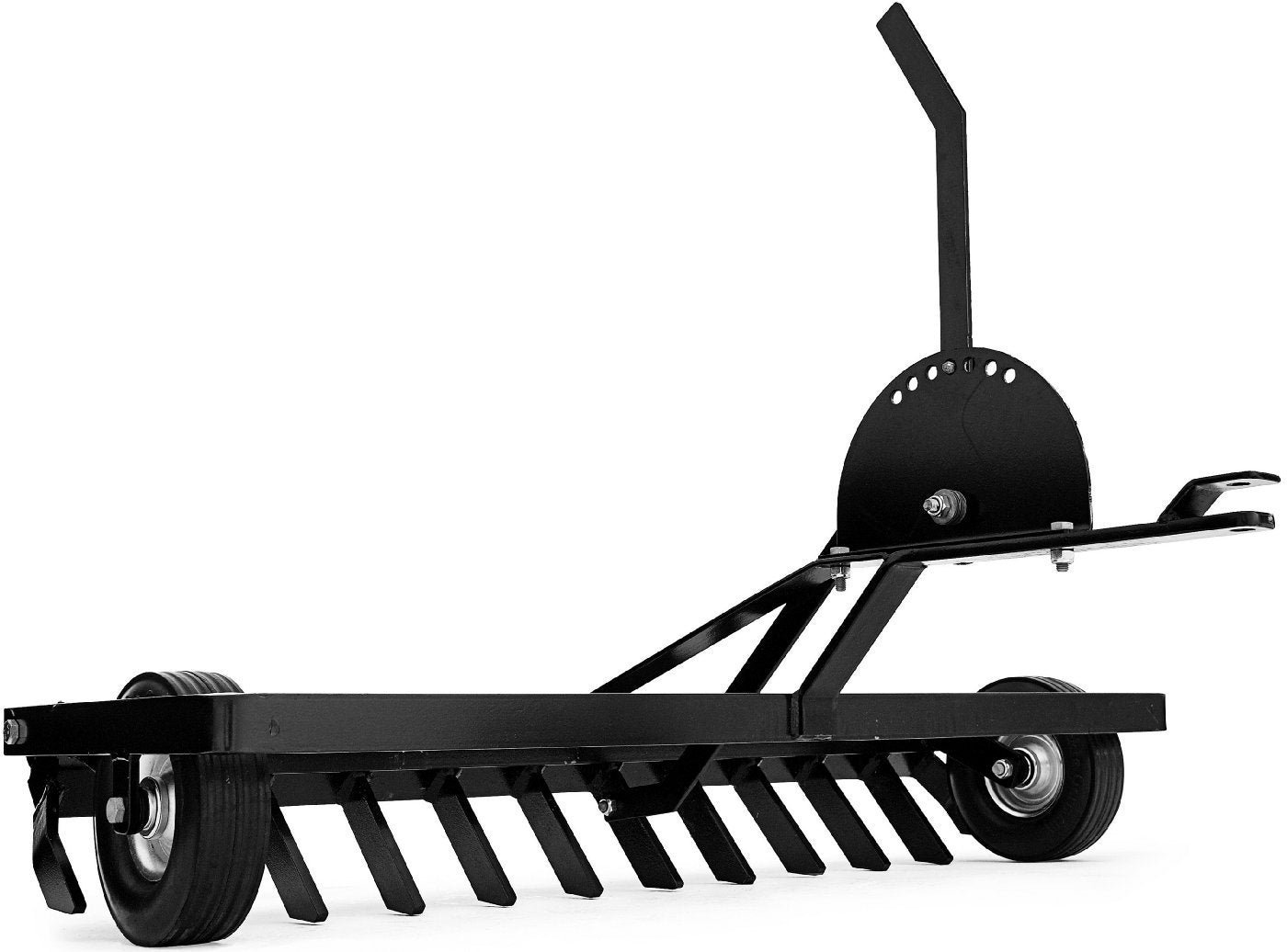 | Robuste Schotterharke mit Gummirädern und verstellbarer Arbeitstiefe |
