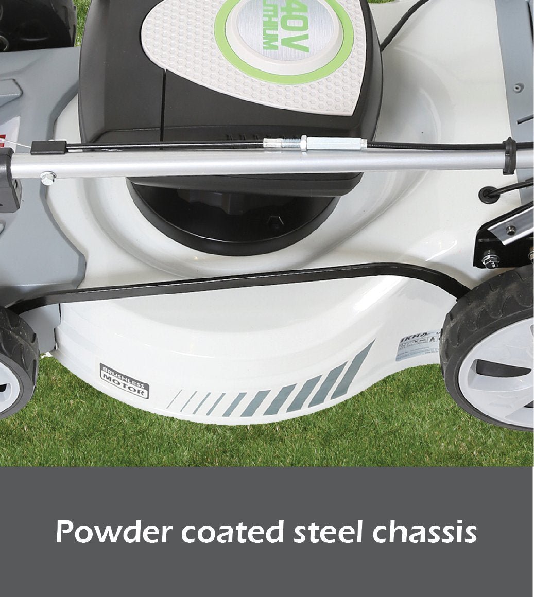 IKRA Akku Rasenmäher IAM 40-4325 mit bürstenlosem Motor und optimiertem Energieverbrauch, Schnittbreite ca. 430mm, Schnitthöhe 6-fach zentral verstellbar 25 – 75 mm, Grasfangbehälter ca. 50l, pulverbeschichtetes Stahlgehäuse und doppelt kugelgelagerte Leichtlaufräder – mit Mulchfunktion (Mulchkit).