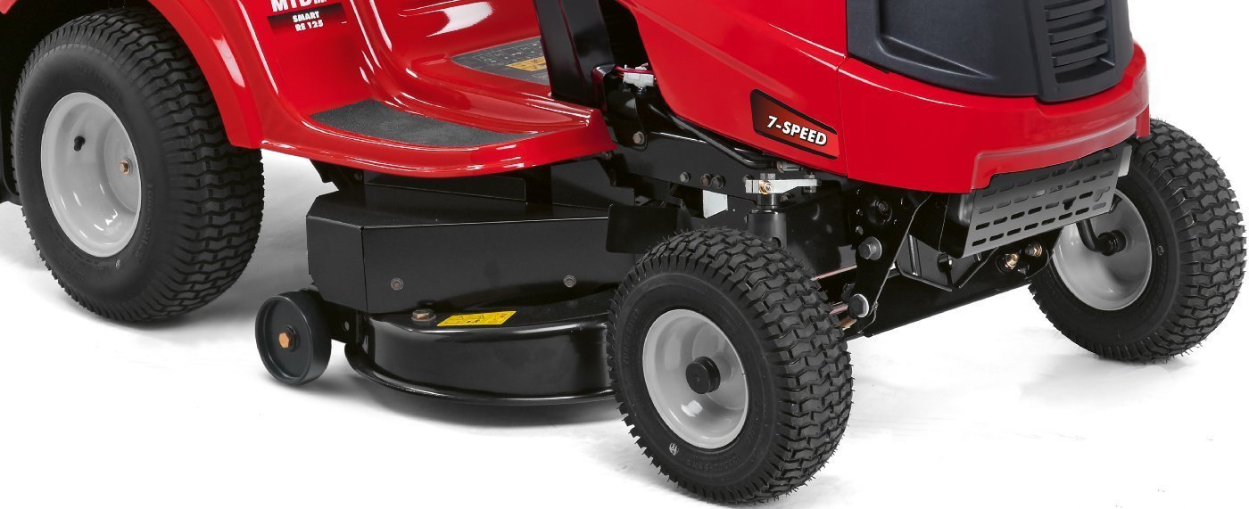 Die Führungsräder am Mähwerk verhindern das Aufsetzen der Messer bei unebenem Gelände.