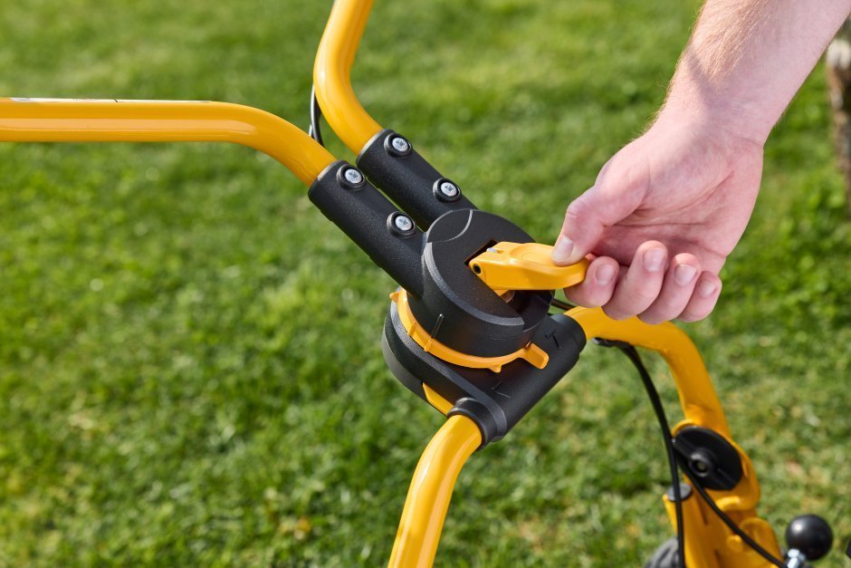 Dank des klappbaren Führungsholm kann der Rasenmäher platzsparend eingelagert oder transportiert werden.