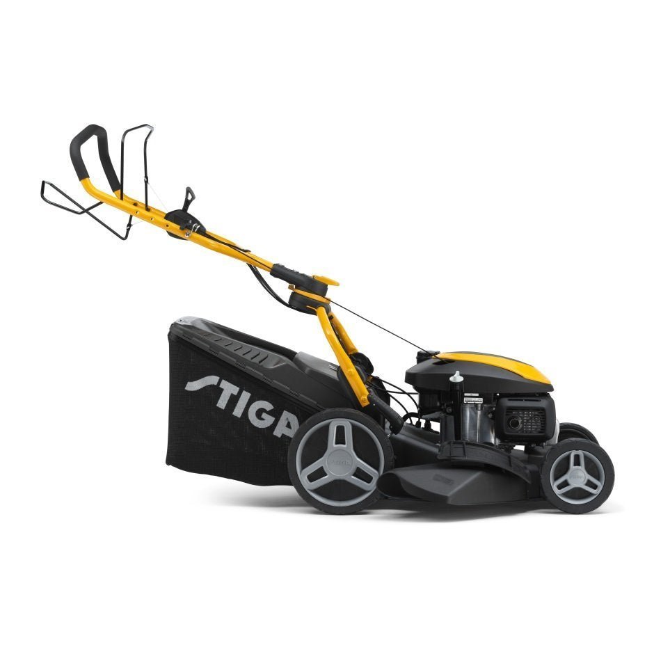 Dank des klappbaren Führungsholm kann der Rasenmäher platzsparend eingelagert oder transportiert werden.