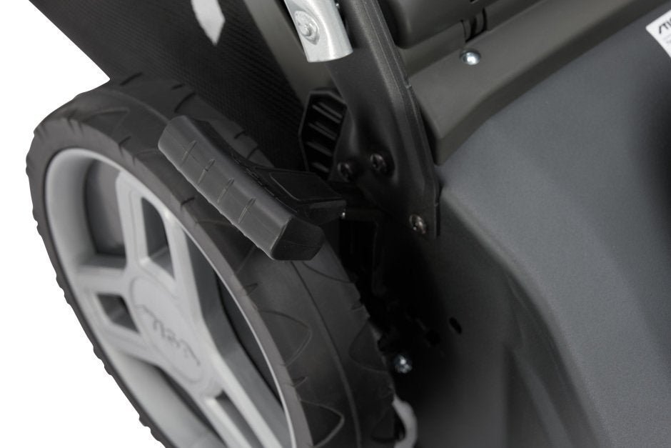 Leichter Transport des Rasenmähers, dank integriertem Transportgriff.