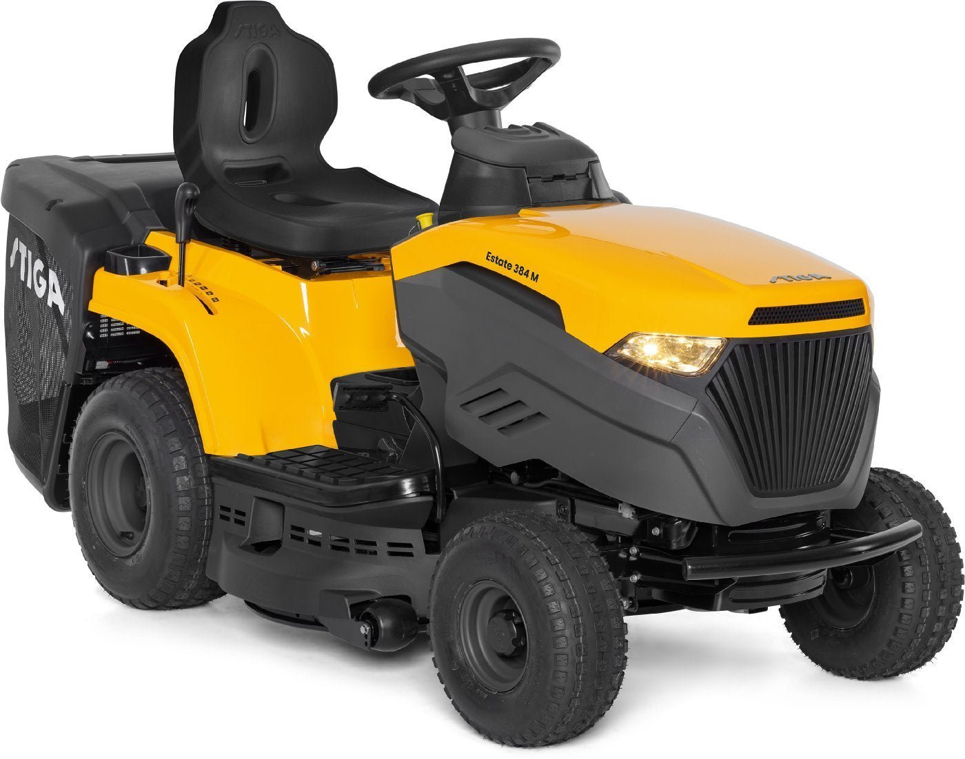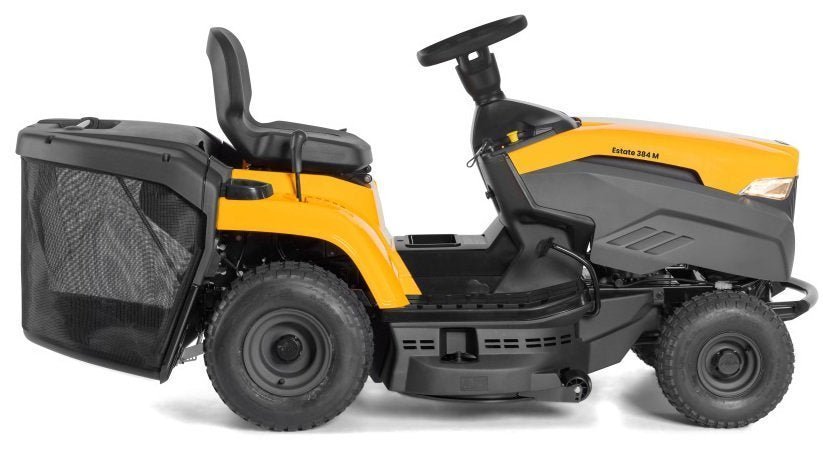 Der Rasentraktor STIGA Estate 384 M ist ausgestattet mit einem ST 400 Powered by STIGA Benzinmotor mit einer Nennleistung von 5,8 kW bei 2400 U/min. Dieser Gartentraktor verfügt über ein Schaltgetriebe mit 5 Vorwärtsgängen und 1 Rückwärtsgang, einen 200 Liter Heckfangkorb und ein erhöhtes ergonomisches Lenkrad für komfortables Fahren. Bei dem 84 cm breiten Mähdeck mit zwei Messern lassen sich 7 verschiedene Schnitthöhen zwischen 25 und 80 mm auswählen. Die praktische elektromagnetische Messerkupplung wird per Tastendruck gesteuert. Der Estate 384 M kann mit dem separat erhältlichen STIGA Multiclip-Dübel auch zum Mulchen von Grasschnitt verwendet werden. Mulchkit und Batterieladegerät separat erhältlich